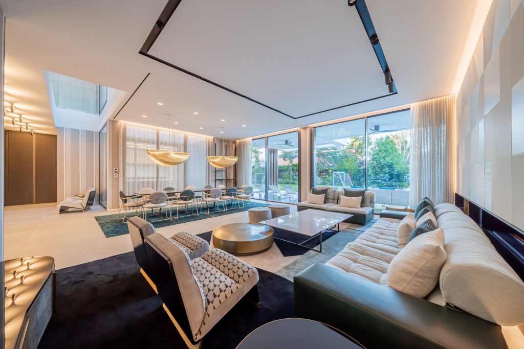 El semisótano alberga una amplia zona de estar, cine y ocio, concebida como un espacio versátil para el entretenimiento, el descanso o reuniones privadas.